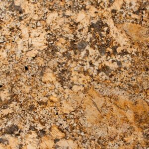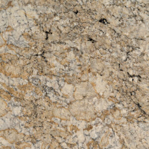 Solarius granite from Brazil features yellow and gold background with darker veins of brown and gray. This durable slab polished granite is recommended for commercial and residential properties including landscaping and flooring in climates with freezing temperatures and all indoor applications.